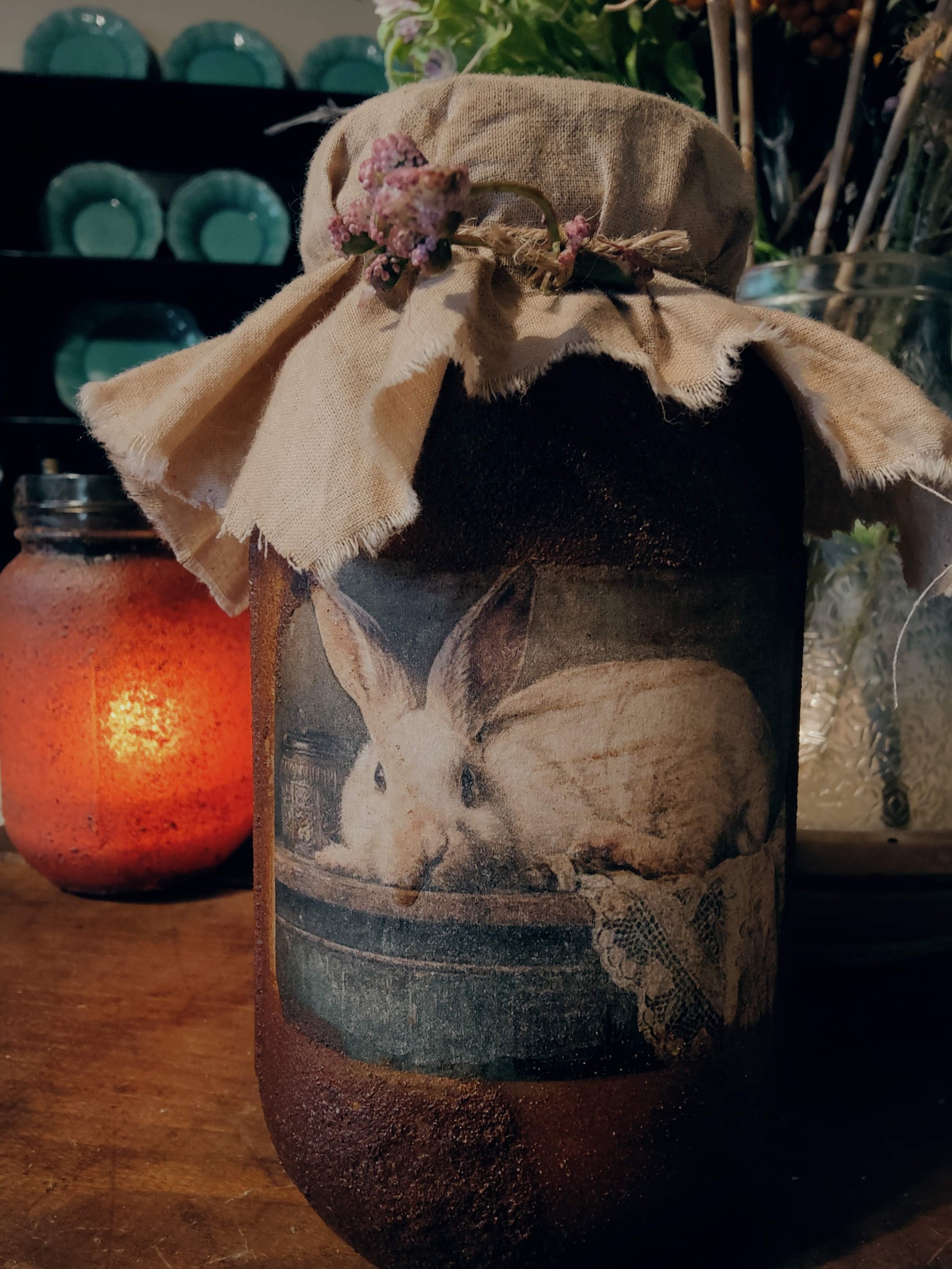 I topped him with an old rusty lid and is covered in a spice grit then added some pretty spring flowers. He's great for Easter and springtime!!