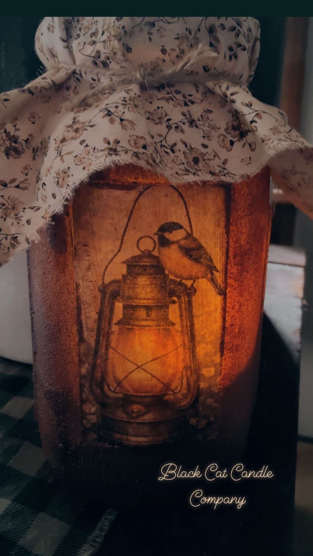 I love how the lantern flickers with the candle light!! And that pretty little spring bird! I covered it with a pretty brown aged floral covering tied on with jute.